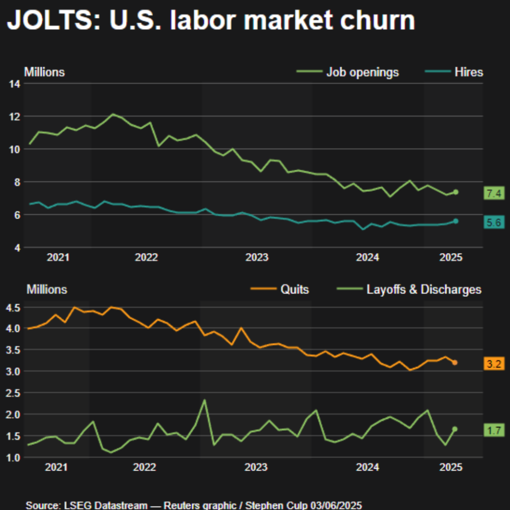 Federal government vacancies rose 13,000 despite a hiring freeze implemented by the Trump administration amid cost cutting. The job openings rate rose to 4.4% from 4.3% in March.