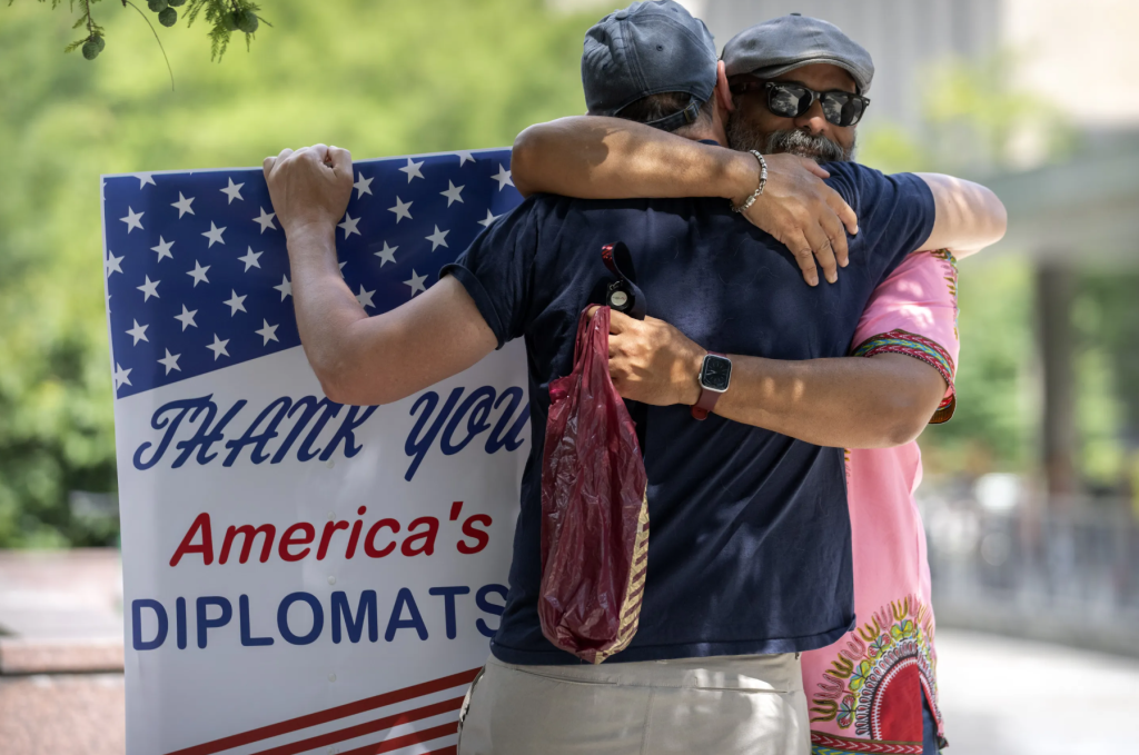 The long lines of applause spilled onto the front step outside of the building, where dozens of former career and political diplomats stood among other demonstrators with signs reading, “Thank you America’s diplomats.”