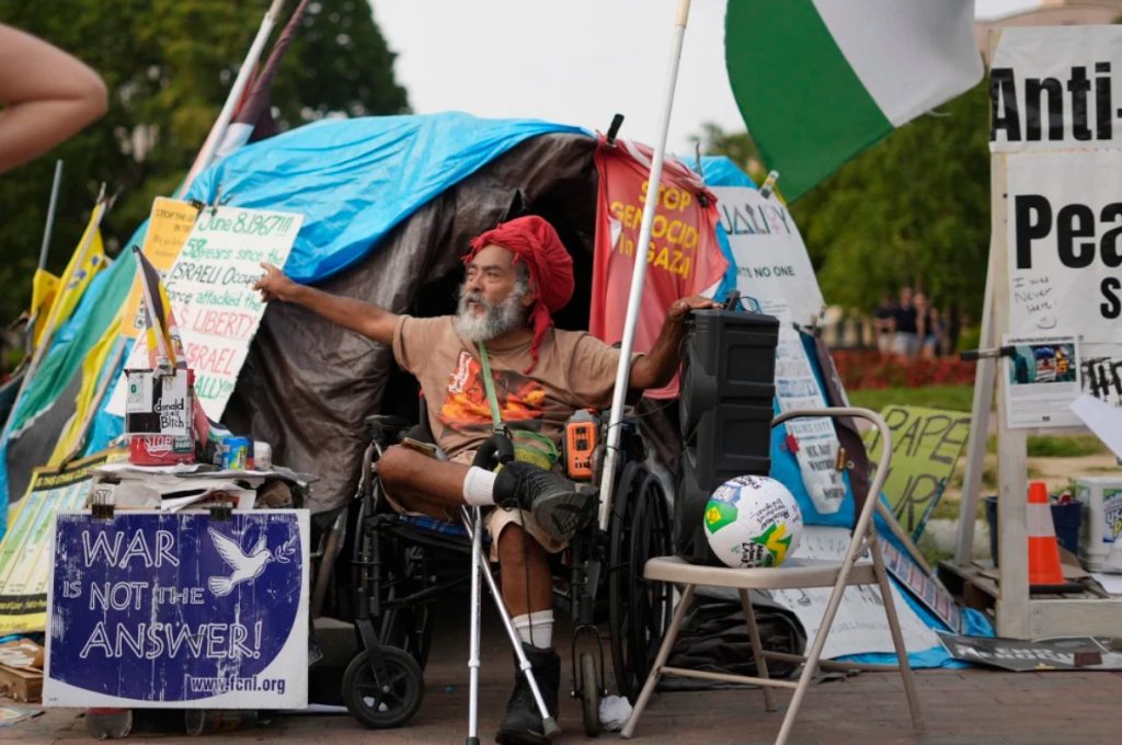 The vigil was started in 1981 by activist William Thomas to promote nuclear disarmament and an end to global conflicts. It is believed to be the longest continuous anti-war protest in U.S. history. When Thomas died in 2009, other protesters like Melaku-Bello manned the tiny tent and the banner, which read “Live by the bomb, die by the bomb,” around the clock to avoid it being dismantled by authorities.