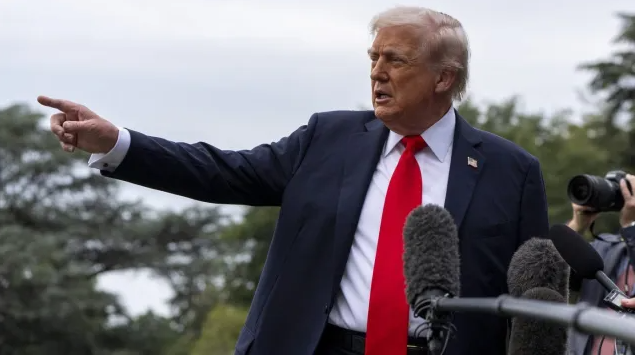 (President Donald Trump points to construction as he speaks with reporters before departing on Marine One from the South Lawn of the White House, Tuesday, Sept. 16, 2025, in Washington.)
