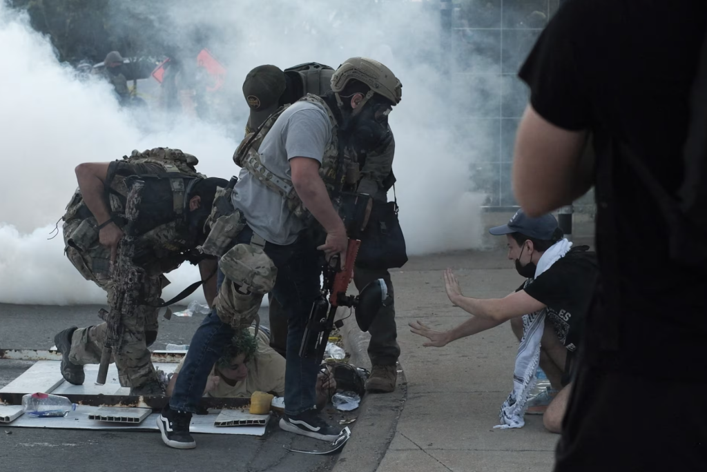 On multiple occasions, demonstrators sitting on the ground attempting to block ICE vehicles from carrying detainees into the facility have been repelled by heavily armed ICE agents using physical force, chemical munitions, and rubber bullets, evoking combat scenes.