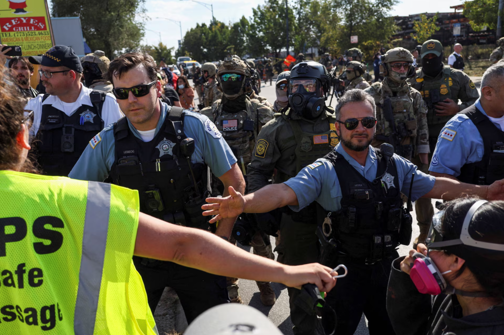 People in the Chicago area have staged repeated protests condemning the stepped-up federal presence. On Friday, police scuffled with hundreds of protesters outside an ICE facility in the Chicago suburb of Broadview.