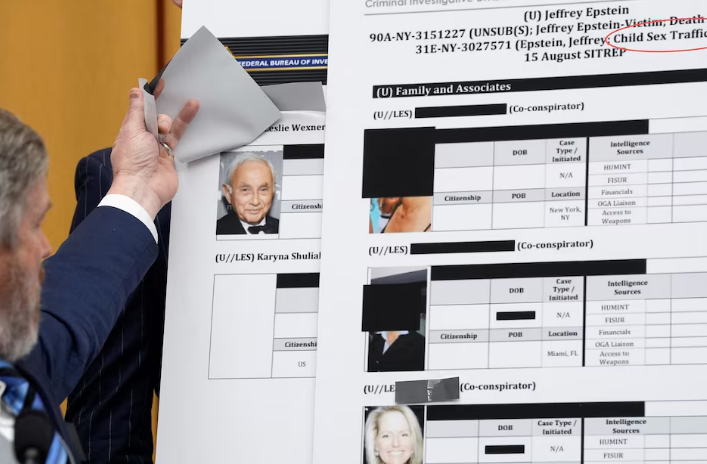 Representative Thomas Massie, a Republican from Kentucky, who helped lead the effort to require the files’ release, accused the Justice Department of a “massive failure” to comply with the law as he questioned why billionaire Leslie Wexner’s name was redacted in an FBI document listing potential co-conspirators in the sex trafficking investigation into Epstein.