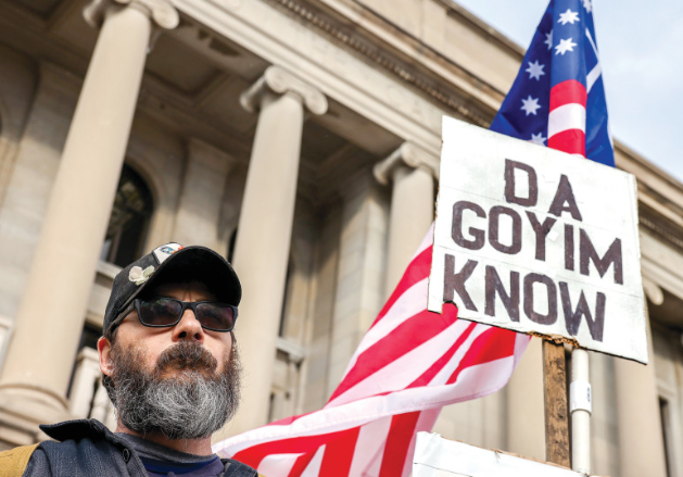 (A protester carries an antisemitic sign outside the Kenosha County Courthouse on the second day of jury deliberations in the Kyle Rittenhouse trial, in Kenosha, Wisconsin, on November 17, 2021)