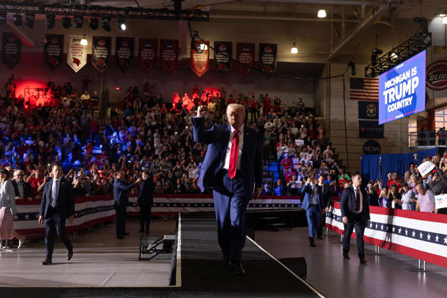 Republican presidential nominee former President Donald Trump arrives for a campaign event at Saginaw Valley State University on Oct. 03, 2024 in Saginaw, Mich.