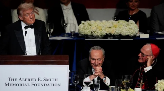 Trump appeared to receive a mixed reception from the audience, which included both Democrats and Republicans. The former president acknowledged certain jokes did not land, including one making light of second gentleman Doug Emhoff’s past affair with a nanny and another referring to former President Obama as “Barack Hussein Obama.”