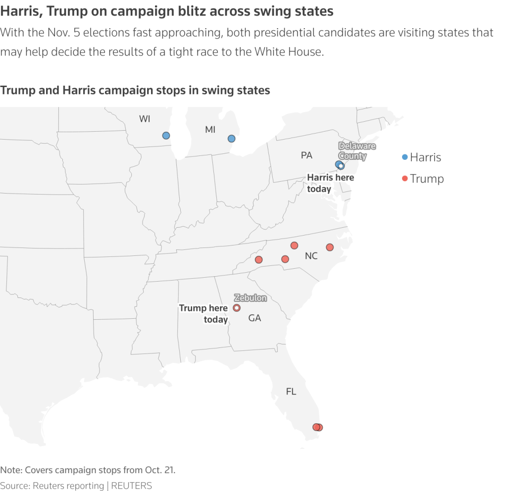 Democratic presidential candidate Kamala Harris told a town hall in Pennsylvania on Wednesday her administration would be different from that of President Joe Biden’s, as Republican Donald Trump campaigned in Georgia, another battleground state.