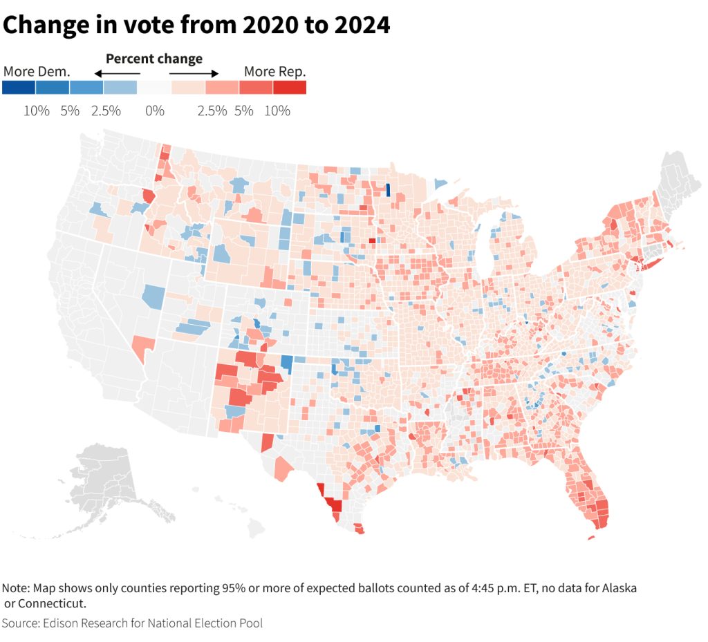 Across the country, in places where almost all votes were counted – roughly 2,200 counties nationwide – Trump’s margin was 5 points higher than it was in 2020.
