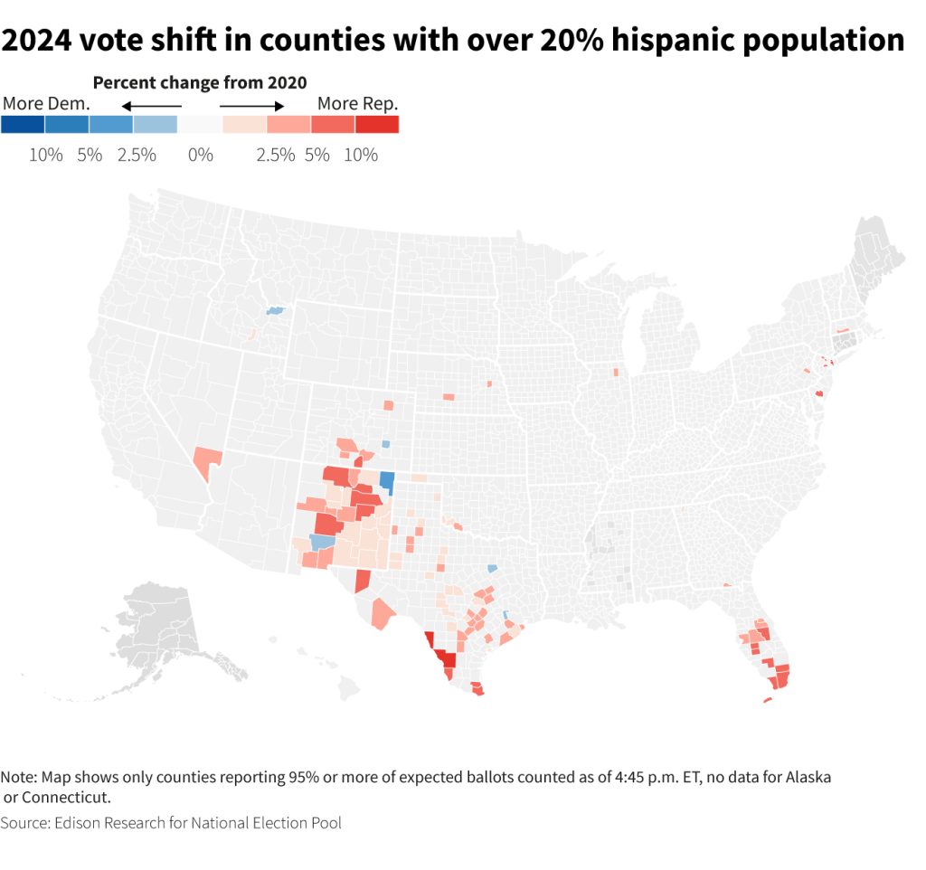 In counties where more than 20% of voting-age Americans were Hispanic, Trump’s margin over Democratic Vice President Kamala Harrisimproved by 13 points relative to his 2020 performance against Biden.